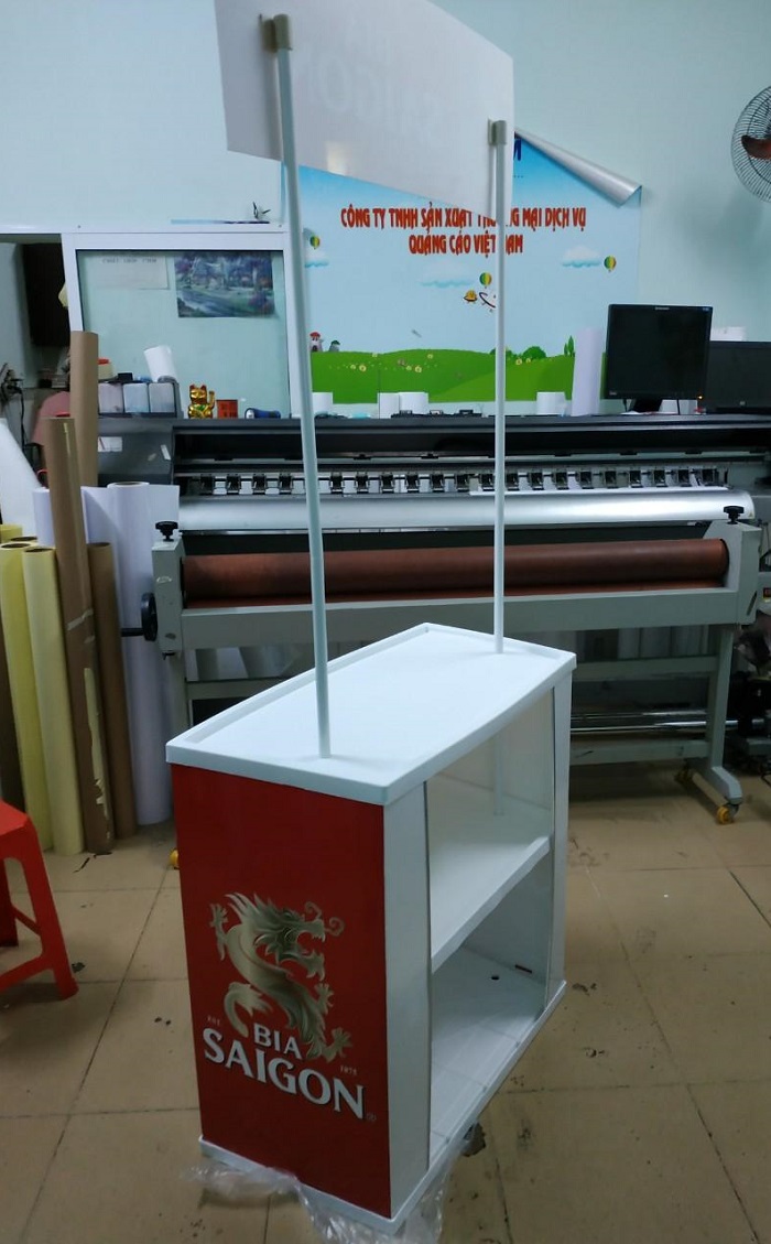 - Booth Sampling làm bằng sắt: Được làm chủ yếu từ các khung sắt và được gia công cẩn thận. Những mối hàn được thợ có tay nghề cao gia công. Chính vì vậy chúng không những có tính thẩm mĩ cao mà còn rất chắc chắn. Các hình ảnh dùng để quảng cáo được in decal ngoài trời và được cán qua tấm format dày 5mm. Phần hình ảnh và phần khung được cố định lại bằng keo dán chuyên dụng. Phần mặt bàn được làm từ hai chất liệu là ốp alu và ván mdf được sơn một lớp sơn chống nước.